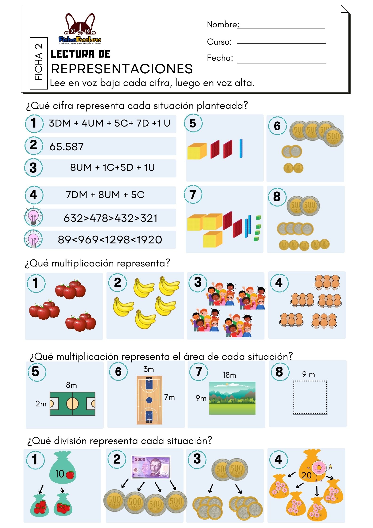 Autor: Fichas escolares.com Ficha con 5 hojas para colorear y contar. Cada ficha tiene tabla de posición hasta la decena para completar con la cifra que corresponda. Láminas para descargar