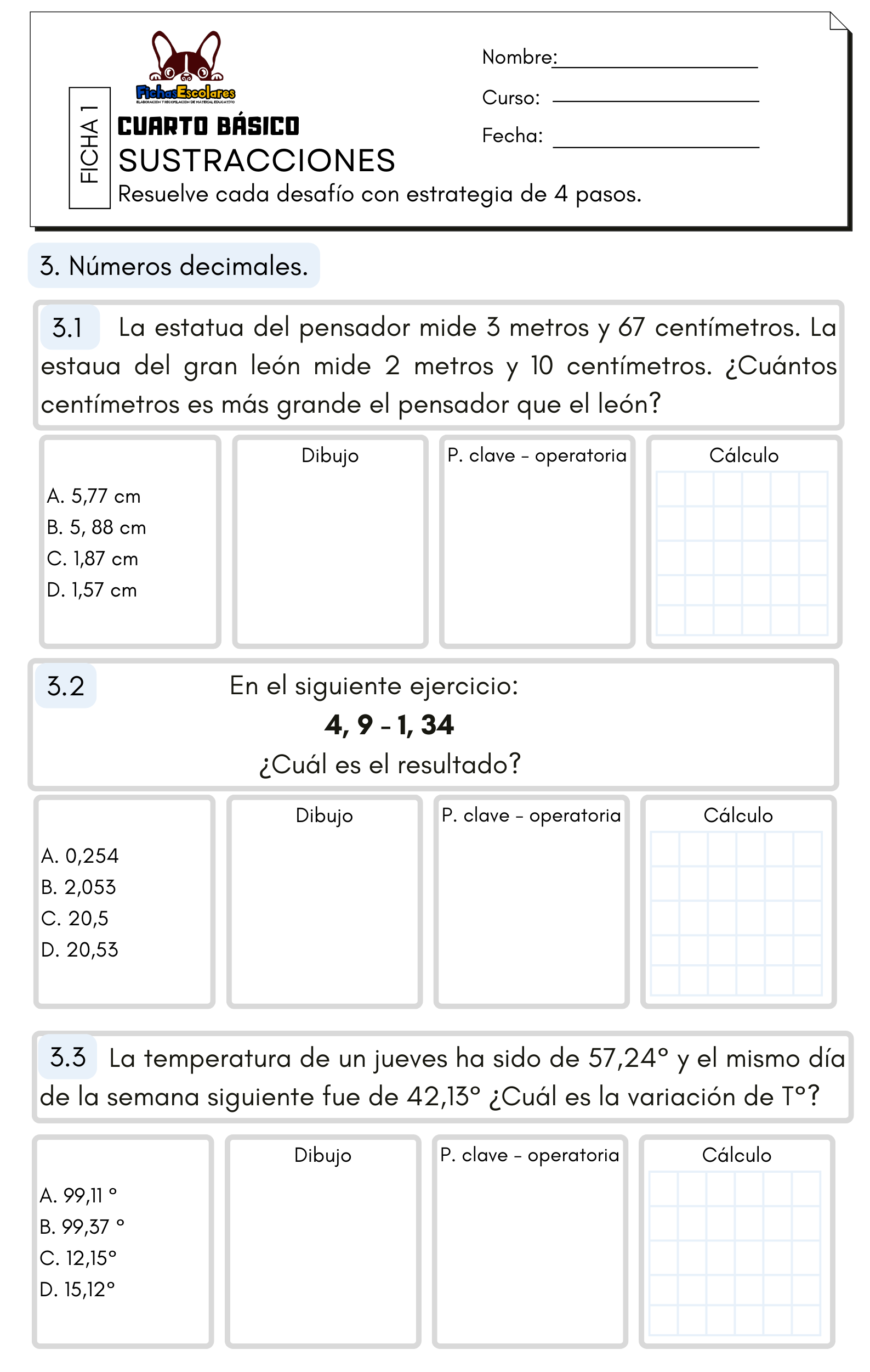 Autor: Fichas escolares.1 hoja con sustracciones con descripción escrita de operatoria. Documento PDF listo para descargar. Excelente recurso para atención y concentración. Share on FacebookTweetFollow usSave